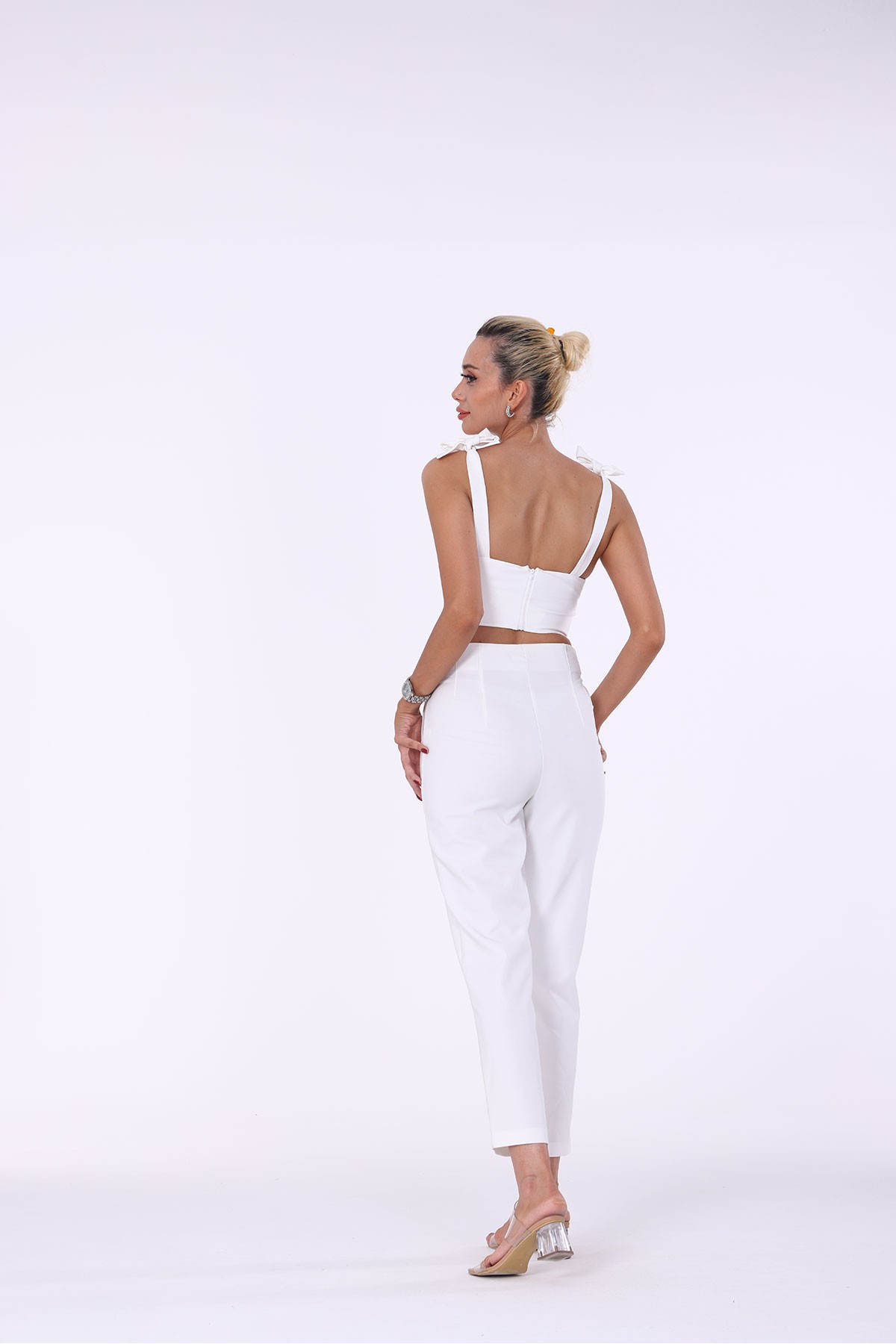 Yüksek Bel Bol Paça V Yaka Yelekli Bayan Takım bej
