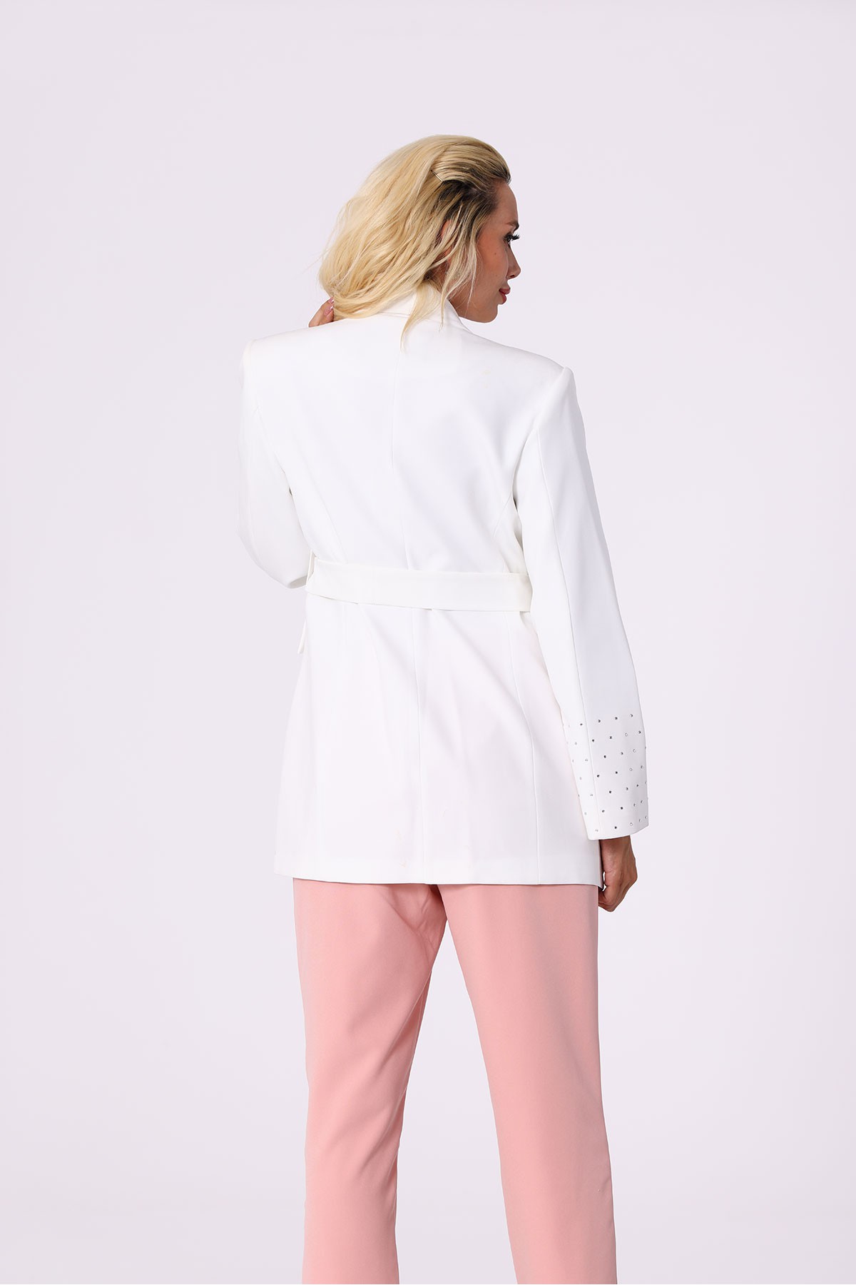 Kolları ve Cepleri Taşlı Kuşaklı Ceket beyaz