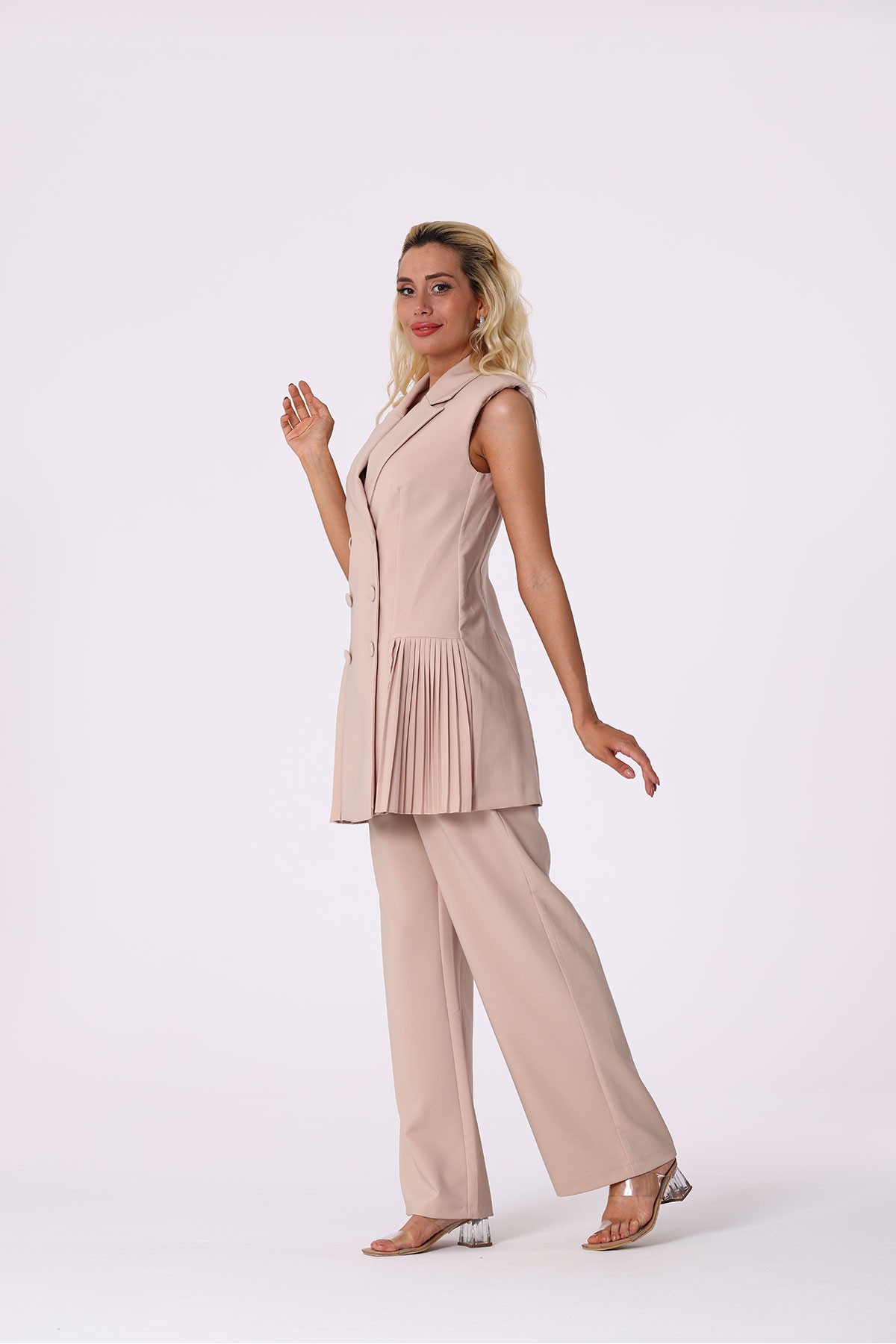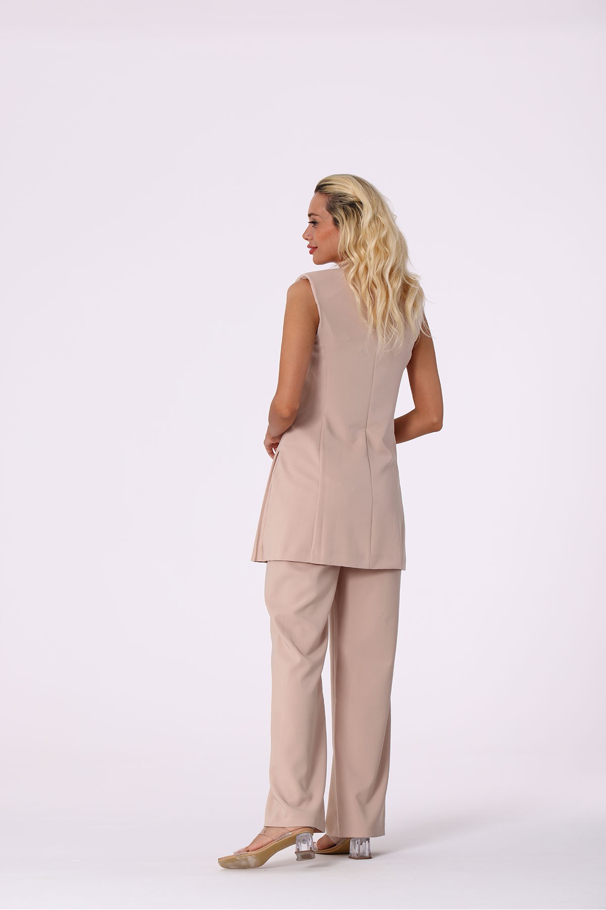Yüksek Bel Bol Paça V Yaka Yelekli Bayan Takım bej