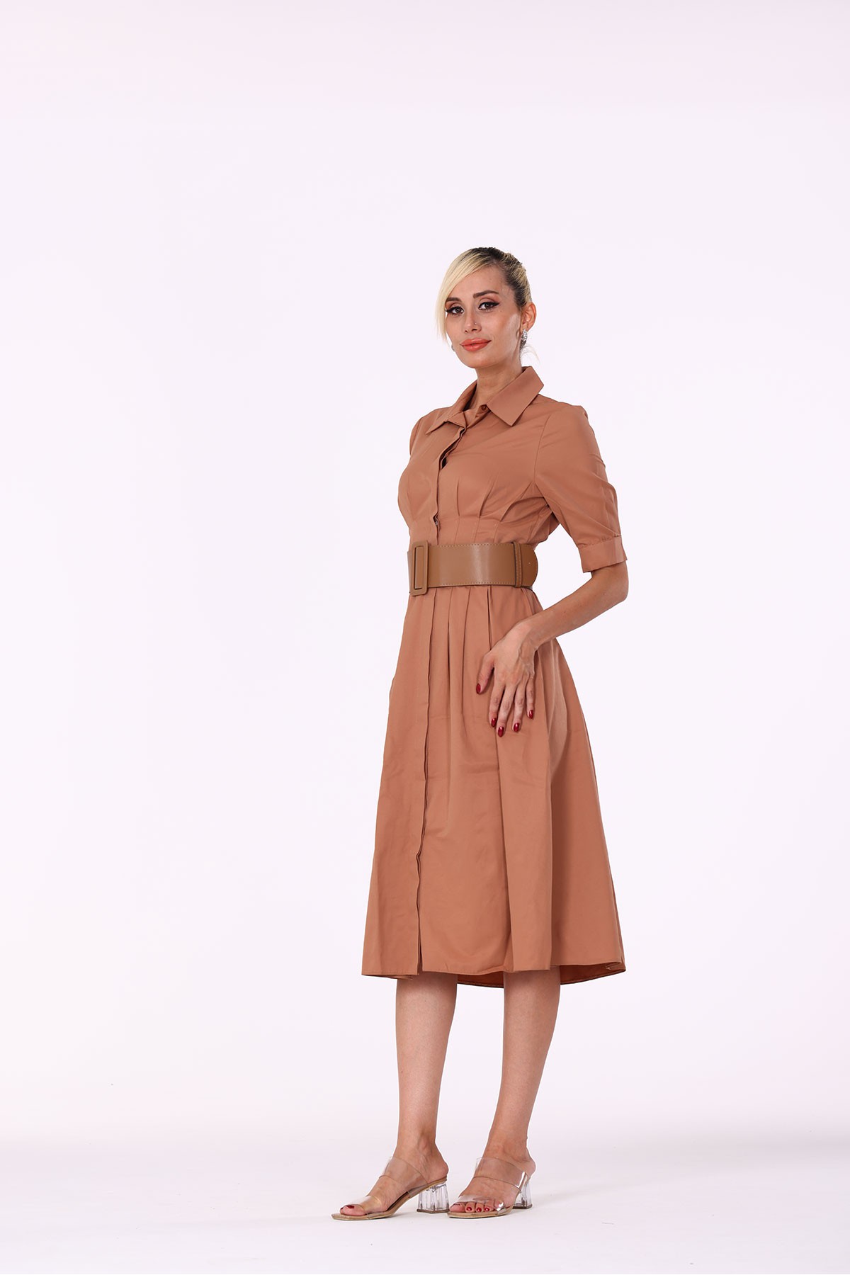 Midi Boy Yarım Kol Kemerli Elbise kahverengi