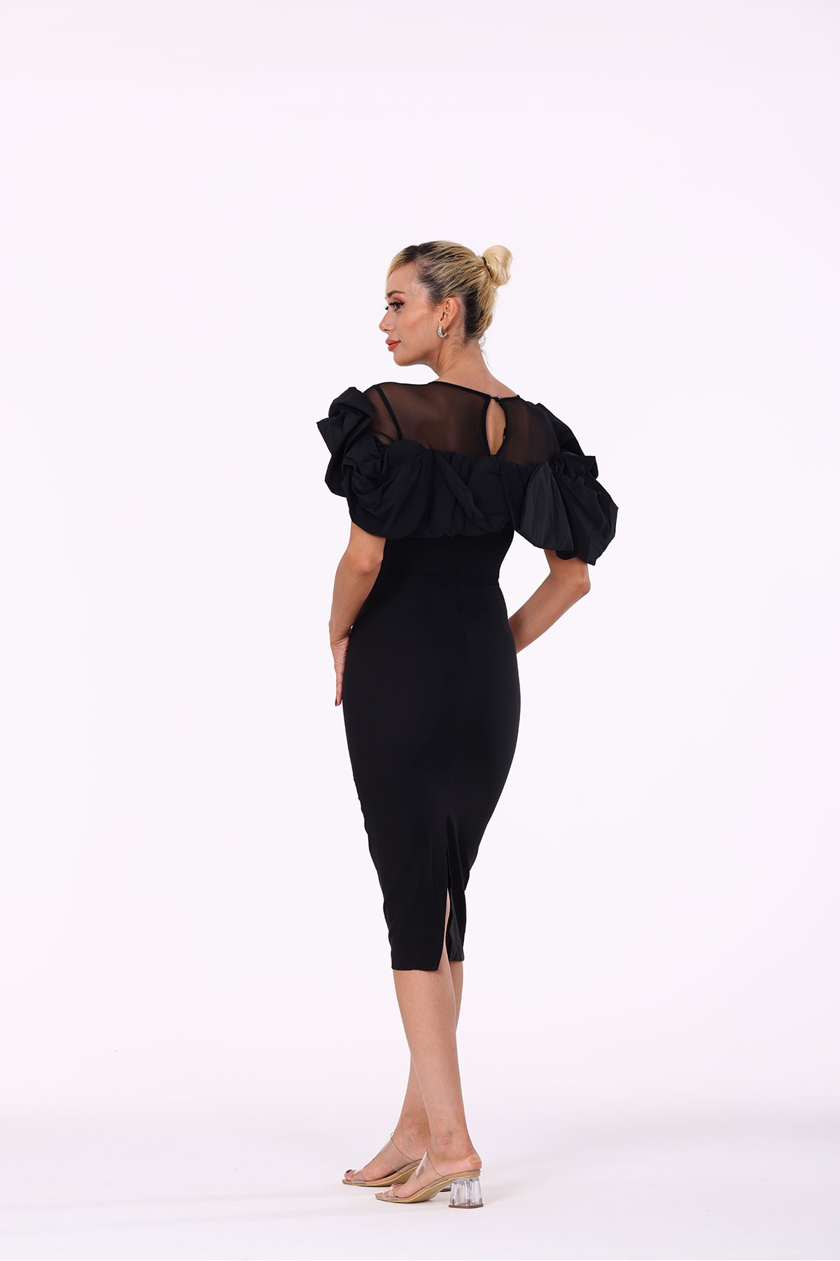 Bisiklet yaka, tül detaylı, fırfırlı, midi boy, krep elbise,• Polyester,%5 Elastan