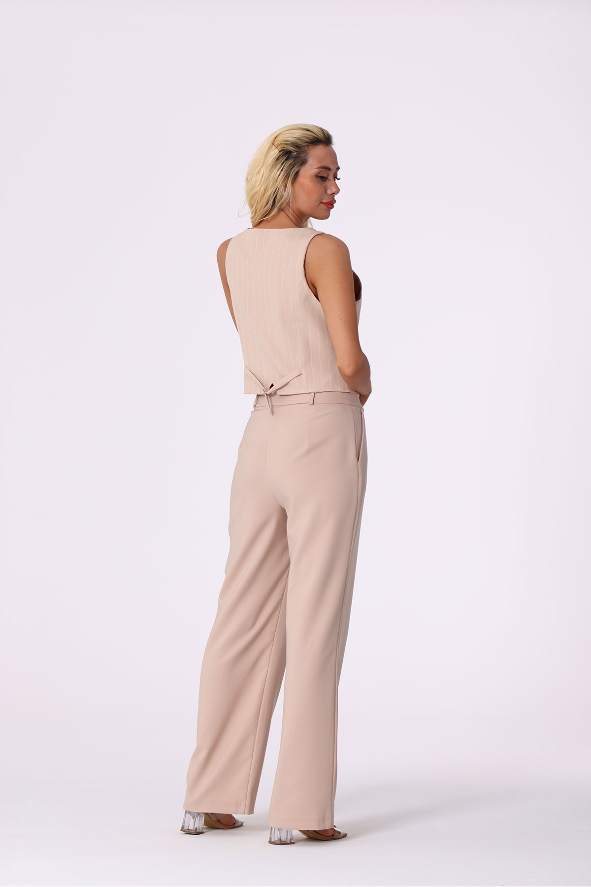Yüksek Bel Bol Paça V Yaka Yelekli Bayan Takım bej