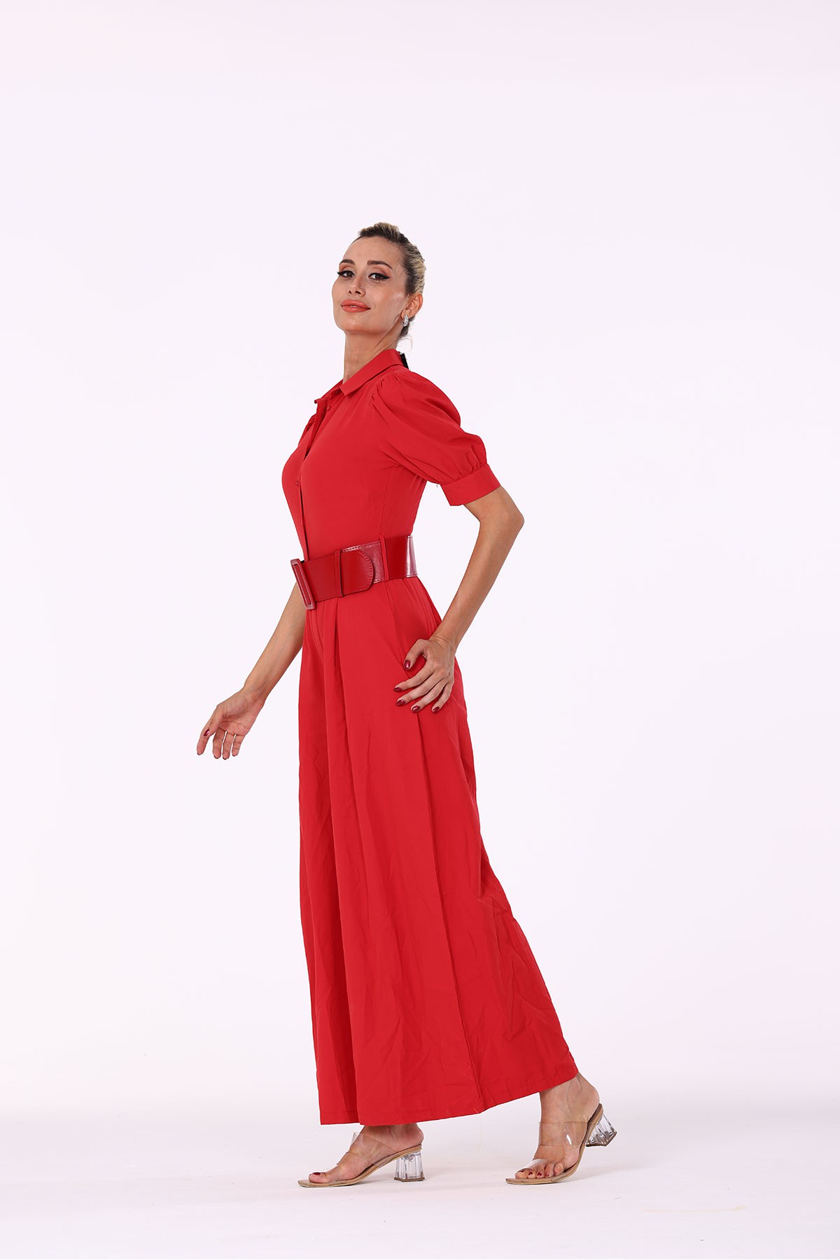 Kadın Yarım Kol Kemerli Tulum  kırmızı